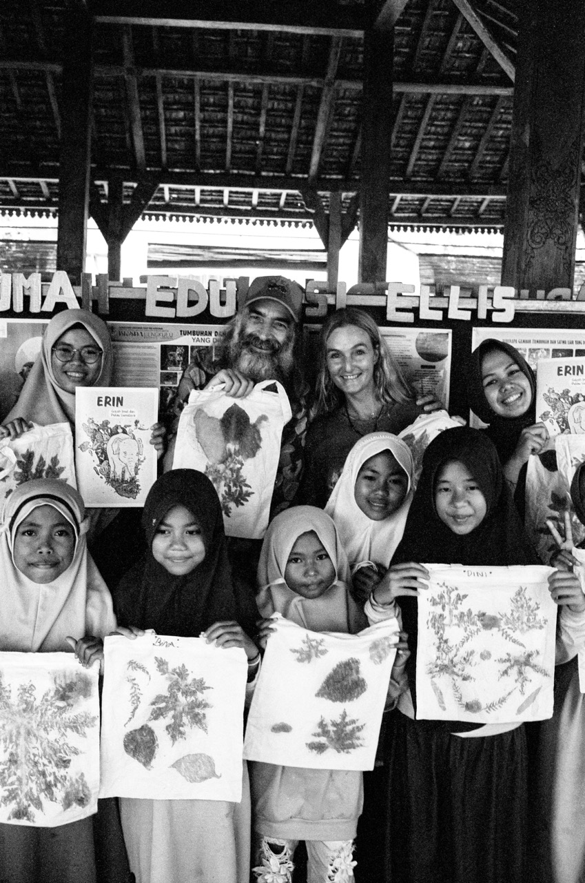 The morning after, the sky is a bright blue dome. Just east of the main office lies a path leading to the education centre. As we approach, we hear the chaotic hammering of children pressing plants. On either side of the path, young saplings rise from the soil, some marked with a small sign of the person who funded it, or to whom it was dedicated: Annie Proulx. Kurt Cobain. Mick Rock.