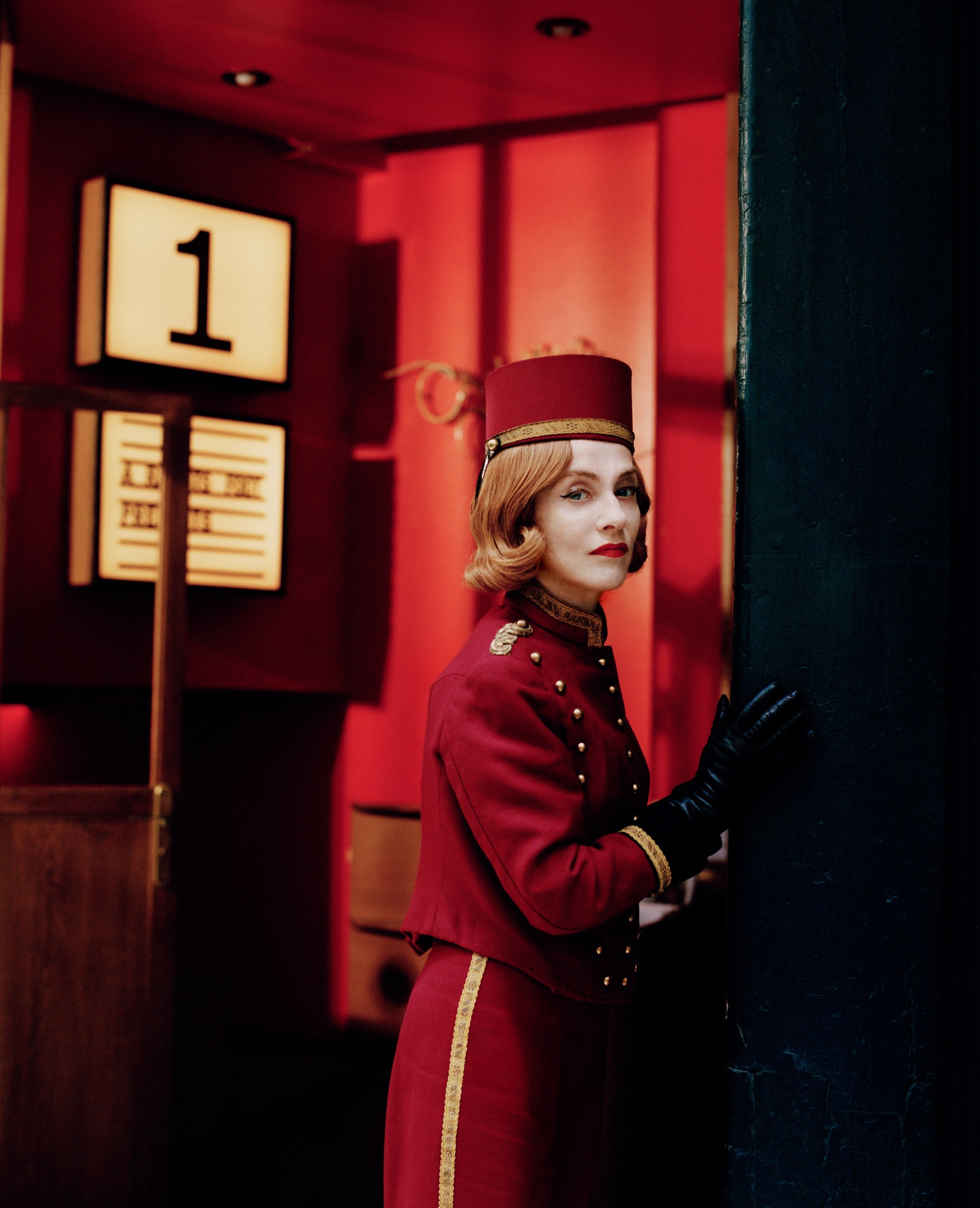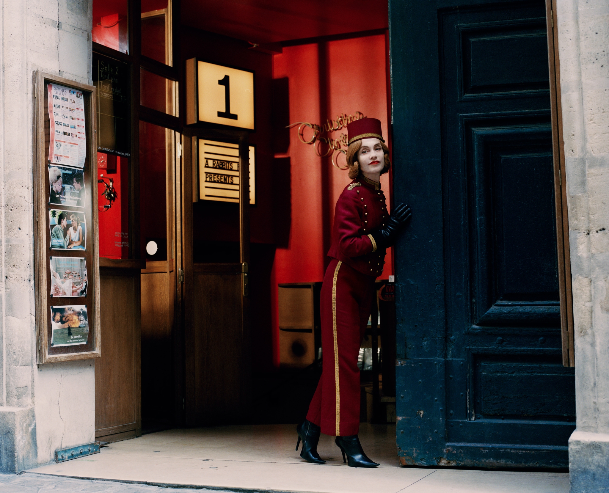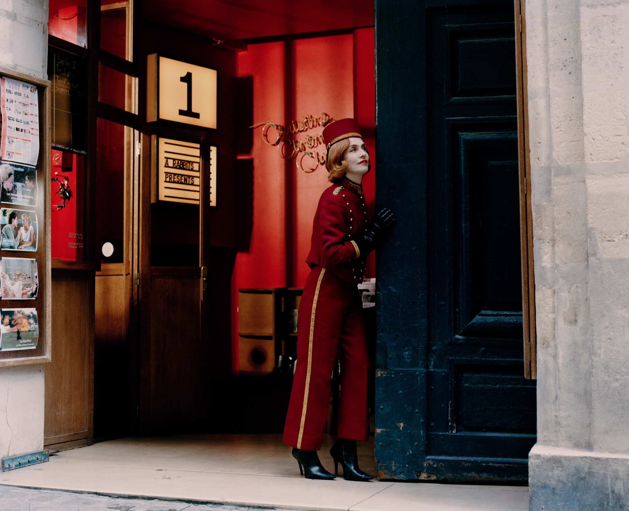 We are at the cinema for our cover shoot with Huppert—which has also been chosen as an opportunity to enlister her for Cinema Saves—A Rabbit’s Foot’s campaign to promote movie-going. A willing participant, Huppert has been styled as a classic Parisian ticket seller. For the second look, she has been dressed in a look inspired by Claude Cahun, a French performance artist and photographer for whom masks or a painted white face were a recurring motif. Towards the end of our shoot, Huppert, still in costume, bites into a jambon-beurre in the street, greeting punters who have arrived for the day’s matinée. Many look a little bemused that the presence of one of the world’s most respected actors, and the patron of their favourite cinema, has come as a freebie with their ticket.