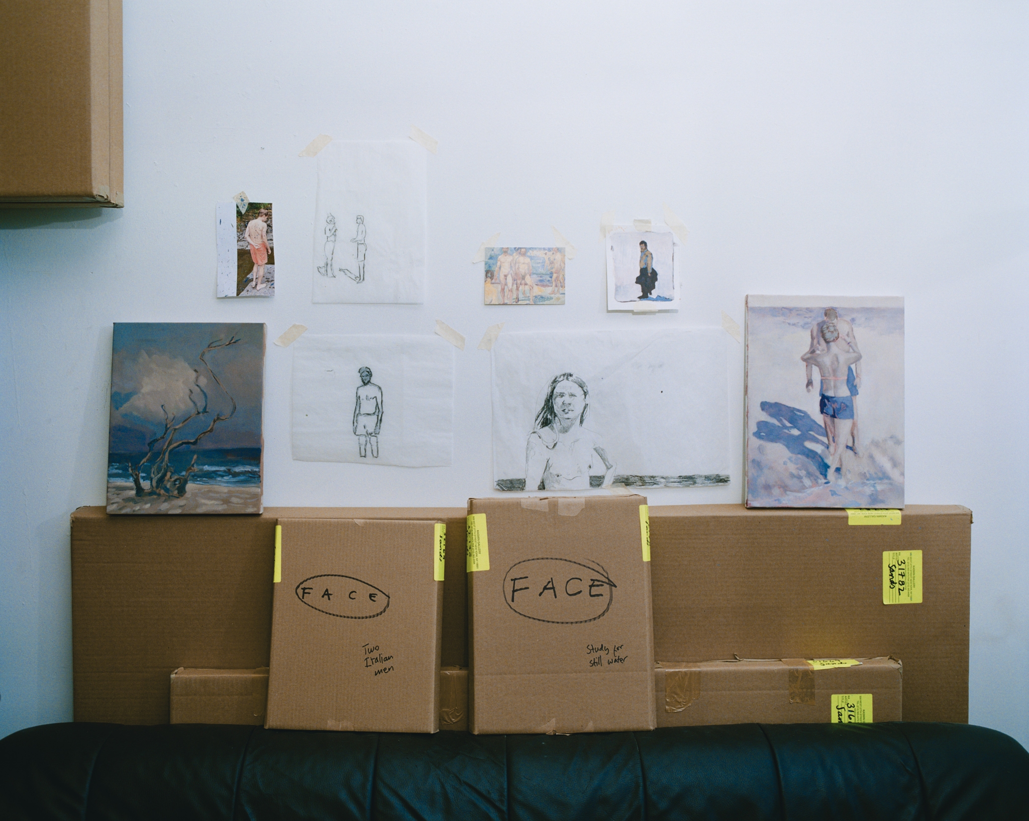 The Williamsburg studio of the London-born painter Emil Sands is filled from floor to ceiling with the artist’s latest creations: vast seascapes and rocky coastal scenes in which figures stand tentatively on beach shorelines. In saturated hues of azure and turquoise blue, the works vibrate with the intense heat of summer; we feel the warmth of beachgoers’ skin as they stand close to cool waters. Created for his first solo show Salt in the Throat at Kasmin Gallery in January of this year, the 26-year-old Sands is now working towards his first UK debut: a three-person group show at Victoria Miro, London, followed by a solo show at Victoria Miro, Venice in the new year. For an artist who only returned to painting seriously three years ago, his work is making big waves in the art world.