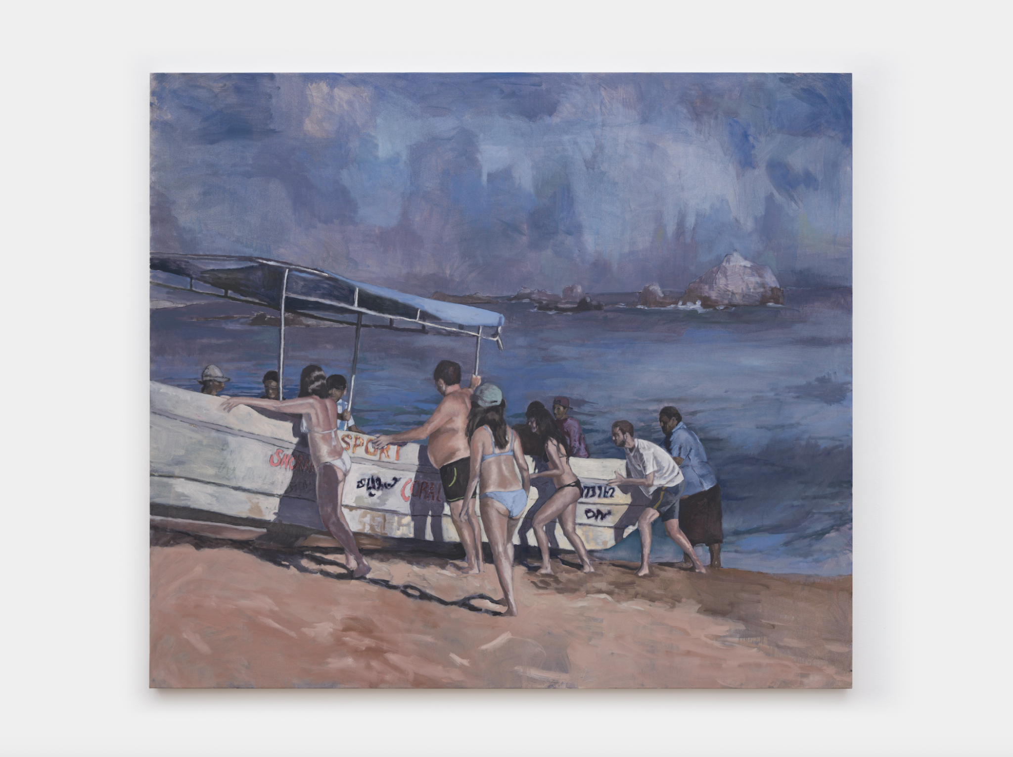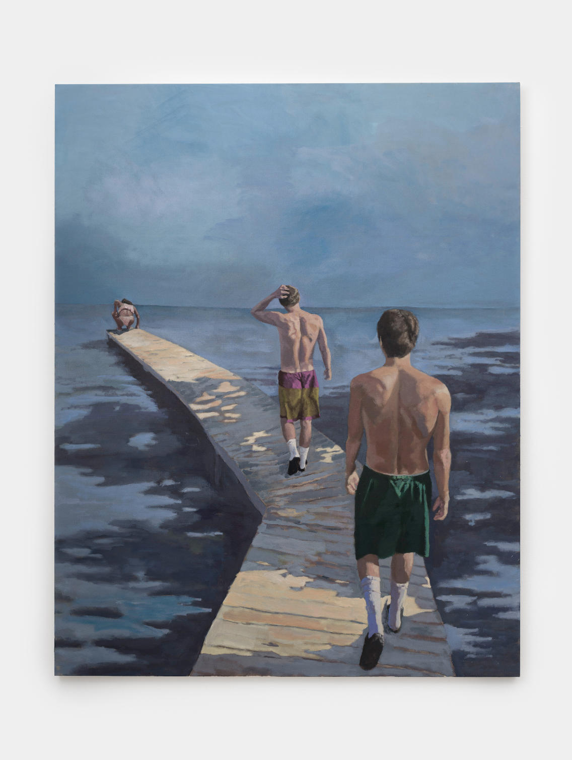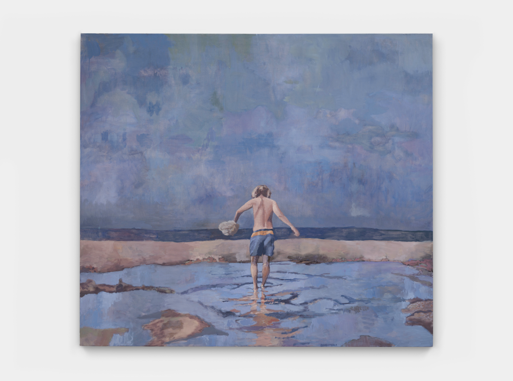 The weighted figures in his paintings take on a quasi-sculptural and statuesque quality. In this sense, his razor-sharp bodily observations reference a long-lasting academic interest in classical antiquity, a subject he studied at postgraduate level before returning to painting. “I understand renderings of the body in ancient art intimately well. I feel close to them, because I’ve studied them and lived with them.” He goes on to explain that the statues of classical antiquity resonated with him because of contrapposto,a pose in which a figure stands with most of its weight on one foot, causing the shoulders and arms to twist off-axis from the hips and legs. “I remember seeing ancient Greek statues as a teenager, and noticing that the contrapposto way of standing resembled how I feel most comfortable standing,” he explains. But unlike representations of the male physique in classical antiquity, Sands isn’t interested in creating perfected, beautified renderings of the body. “I want the bodies I paint to feel really fleshy and alive, rather than idealised . The bodies I paint are of real people doing real things.” The figures in the foreground of Sands’ paintings walk along shorelines, stand in shallow waters, or peer out into the distance. They are ordinary, and, for the most part, unaware they are the subject of voyeurism.
