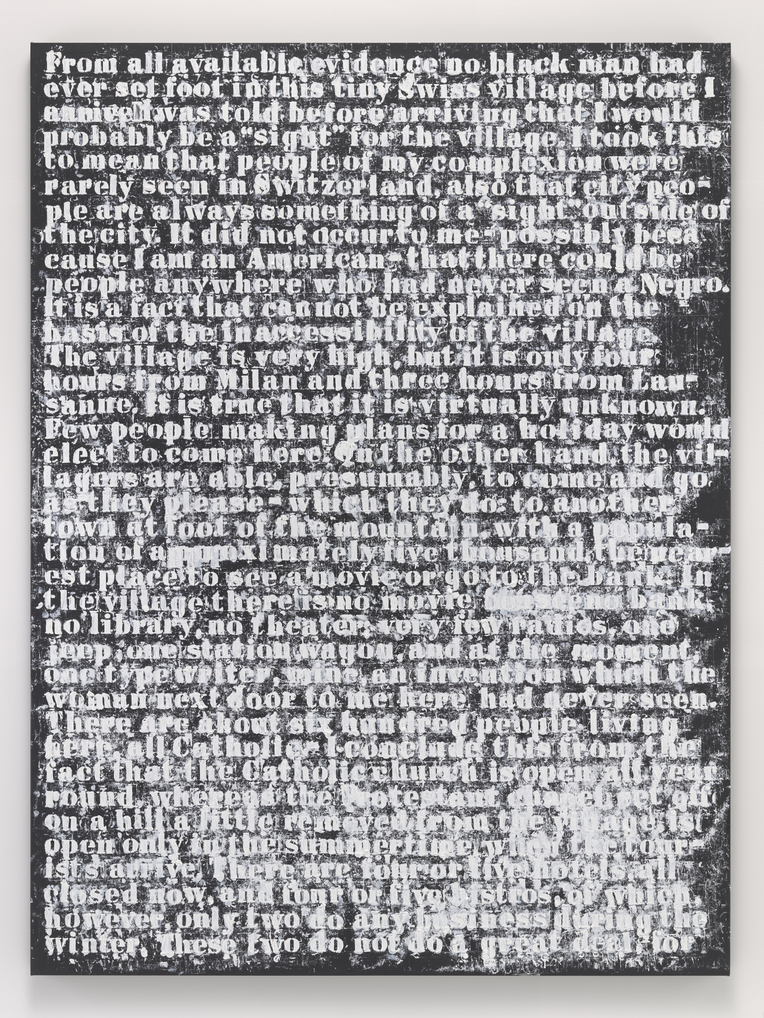 Born in the Bronx, New York in 1960, Ligon is a multidisciplinary artist whose work spans painting, neon, video, printmaking, and other media. Drawing on literature, history, and his experiences as an African American gay man, Ligon explores the complexities of Blackness and the enduring legacy of race in America, and his practice critically examines societal power structures, representation, and the narratives that shape cultural understanding. Central to Ligon’s practice is his use of text as a means to examine how racial identity is constructed, perceived, and lived. He frequently incorporates and transforms the words of African American authors such as James Baldwin, often rendering their words in ways that obscures their legibility. For many of his canvas works, Ligon often uses oil-stick that is smeared through lettered stencils. Ligon applies the pigments across surfaces—sometimes on canvas, sometimes on unconventional supports such as doors—creating layered, smudged, and partially obscured words. In his ongoing Stranger series (started in 1997), based on James Baldwin’s essay “Stranger in the Village” (1953), Ligon excerpts Baldwin’s reflections on being a Black person visiting a small Swiss village. Baldwin’s text is a reaction to isolation and the untranslatability of Black experience; his words are rendered in stenciled letters that smear and fade. As the stencils drag the paint downwards, residue accumulates, growing denser and heavier towards the bottom of the piece, reflecting on the weight of history, identity, and cultural memory. As these fragments of words often verge on illegibility, the work is a deliberate act of emphasising the tension between visibility and erasure inherent in the Black experience. By distorting words, Ligon creates a playing field where meaning slips beyond conventional definitions, inviting viewers to engage with the indelible qualities of language and identity. His work becomes a living, breathing experience; a visceral exploration of what happens when words both reveal and conceal the stories they carry.